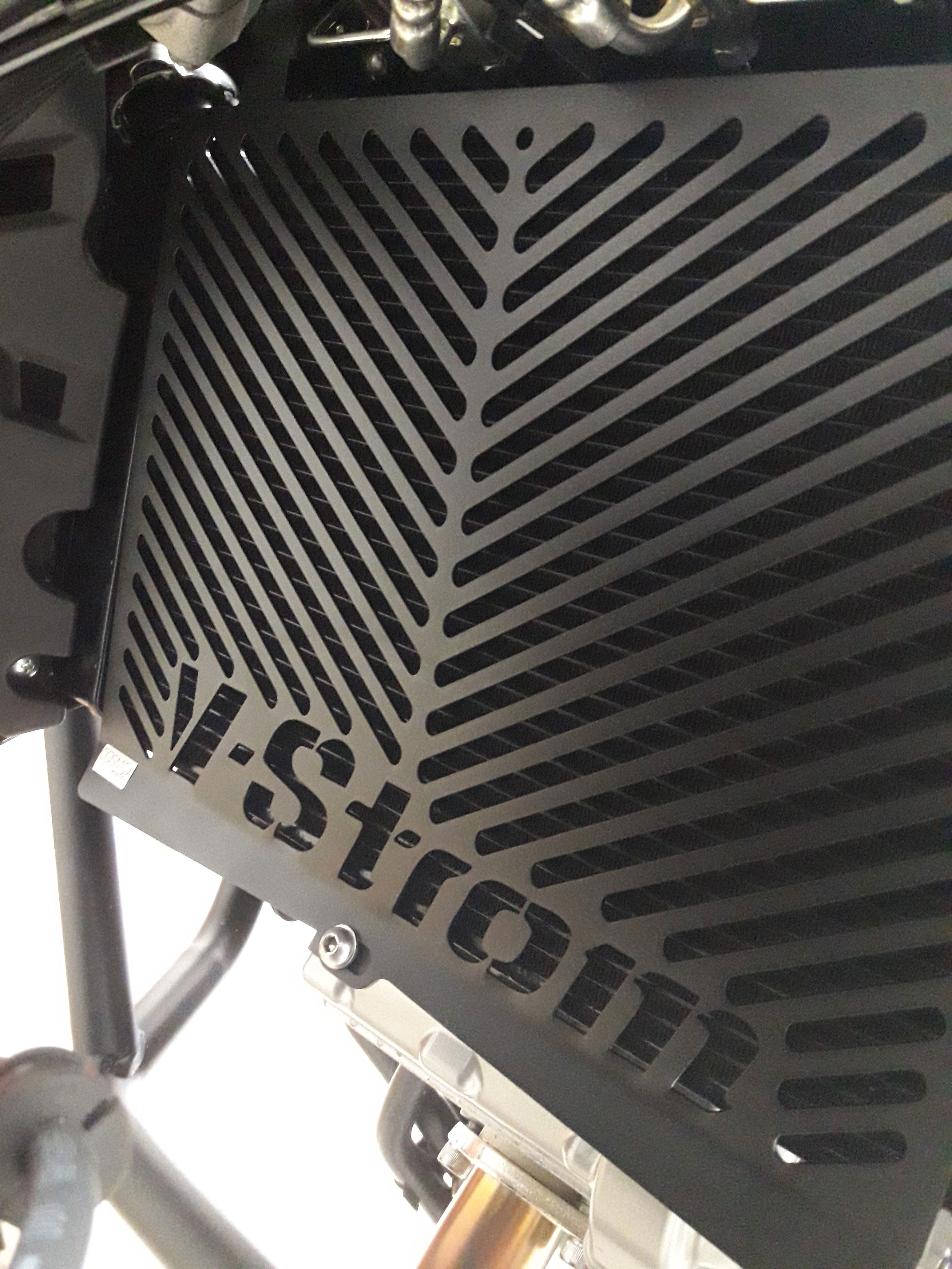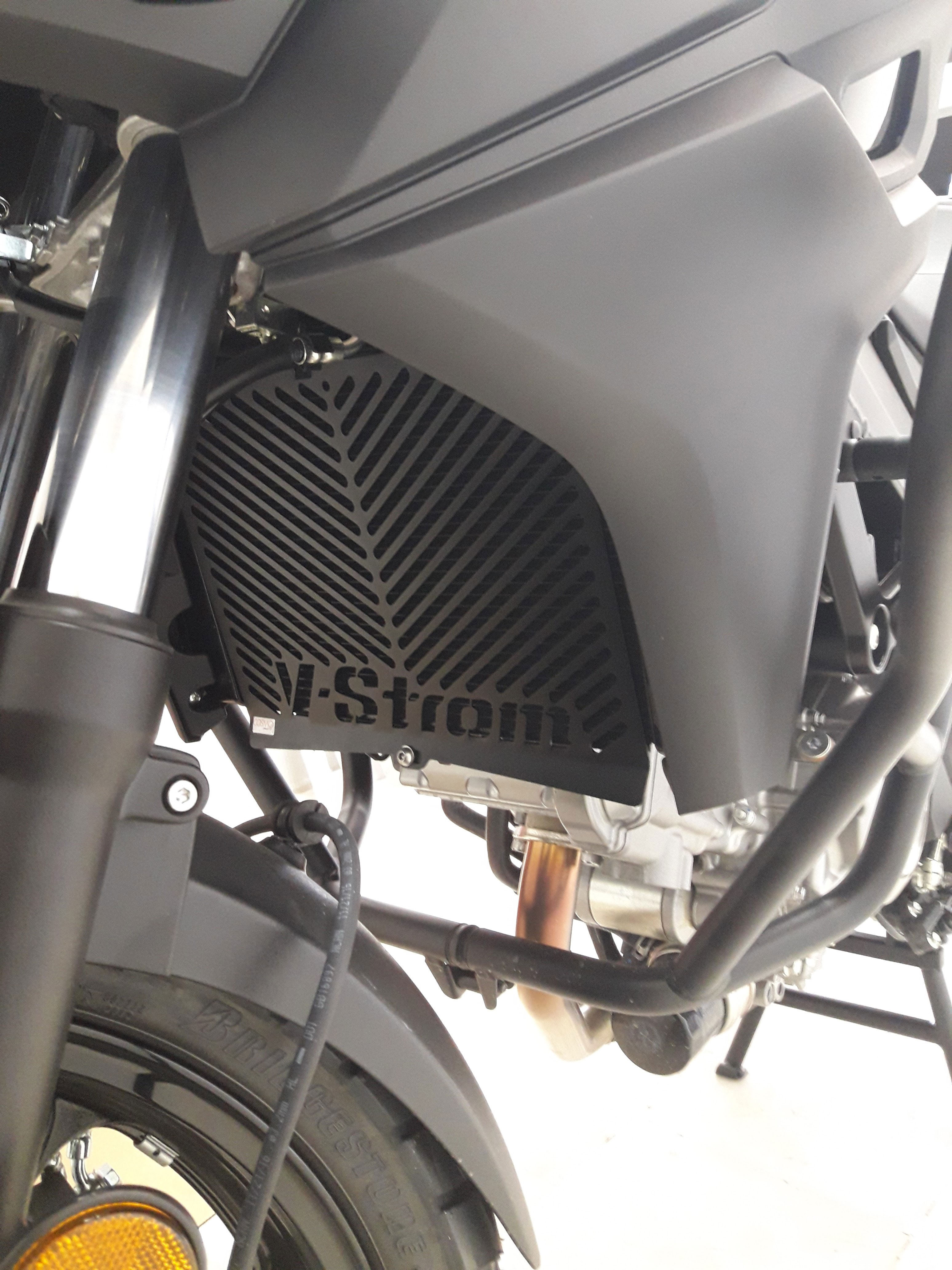 Radiator guard, with v-strom logo on front and suzuki logo on the sides.
